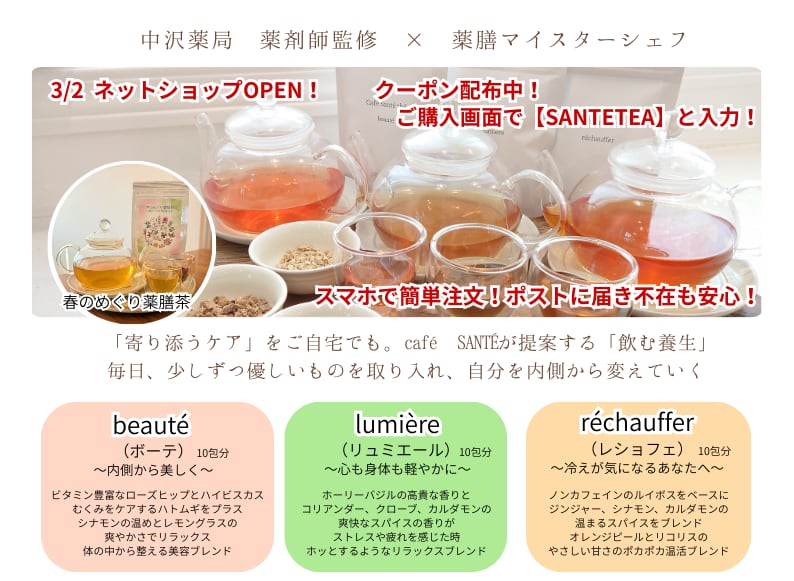 こんなあなたにおすすめです。 最近、なんとなく疲れが取れない…」 「冷えやむくみが気になる…」 そんな日々の不調を、毎日のティータイムで整えてみませんか? 山梨県の中沢薬局が運営しているカフェ「Café SANTÉ(カフェサンテ)」で愛されている、薬剤師監修・薬膳マイスターシェフ考案のオリジナル薬膳ハーブティーです。 ご自宅のポストにお届けしますので、不在時でも安心してお受け取りいただけます。 ■ セット内容(計30包) その日の体調や気分に合わせて選べる、3つのブレンドを全てセットにしました。 1. beauté(ボーテ)〜内側から美しく〜 【こんな時に】むくみが気になる、肌の調子を整えたい時に。 ビタミン豊富なローズヒップやハイビスカスに、ハトムギ、シナモン、レモングラスをブレンド。酸味と温かさで巡りを整えます。 2. lumière(リュミエール)〜心も身体も軽やかに〜 【こんな時に】ストレスを感じる、リフレッシュしたい時に。 ホーリーバジル、コリアンダー、クローブ、カルダモンなどのスパイスが、爽やかに「気」の巡りを助けます。 3. réchauffer(レショフェ)〜冷えが気になるあなたへ〜 【こんな時に】手足が冷える、温活をしたい時に。 ルイボスをベースに、ジンジャー、シナモン、カルダモンなどの温めスパイスを贅沢にブレンド。やさしい甘さで心もほぐれます。 ■ 商品詳細 ・名称:ハーブティー ・内容量:各ハーブティー1袋あたり30g 3袋90g ・監修: 薬剤師 × 薬膳マイスターシェフ ■【OPEN記念 300円割引クーポン】 ・お会計時のクーポンコード「SANTETEA」 ■お召し上がり方 お茶パックにティースプーン1杯または2杯(3g)入れます。ティーポットや急須に入れて 熱湯250~500ml注いで5分ほど抽出します。やけどに注意をして冷ませてからお飲みください。 ■取り扱いの注意事項 1日ティースプーン1~2杯(3g)を目安にお召し上がりください。 必要以上の摂取は避け、体調や体質に合わない場合は摂取を避けてください。 開封後はチャックをしっかり閉め、お早目にお召し上がりください。 ハーブティーは1日以内にお召し上がりください。 ■摂取を控えること 妊娠中、授乳期間中は摂取を控えること 今までに薬や食べものでかゆみや発疹等アレルギー症状を起こしたことが ある場合には摂取を控えること 桂皮アレルギー(シナモン)の方はご注意ください。 ■ 発送について ・送料:全国一律 430円 ・配送方法:日本郵便(クリックポスト等) ・環境に配慮し、簡易包装での梱包でお届けします。